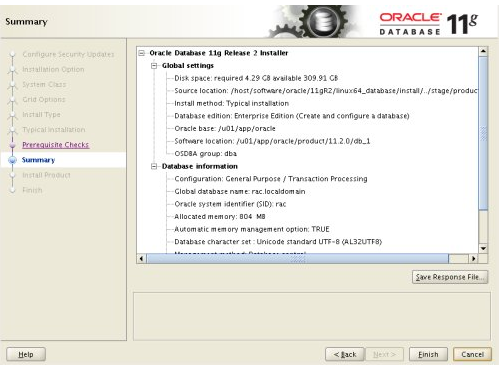 Enter "/u01/app/oracle/product/11.2.0/db_1" for the software location. The storage type should be set to "File System" with the file location set to "/u01/oradata". Enter the appropriate passwords and database name, in this case "RAC.localdomain"