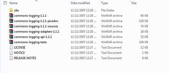 你可以从 http://commons.apache.org/logging/ 下载 Apache Commons Logging API 的最新版本。一旦你下载完安装包,并且解压二进制的发行版本到一个方便的位置。例如在 windows 上的 C:\commons-logging-1.1.1 中,或在 Linux/Unix 上的 /usr/local/commons-logging-1.1.1 中。该目录将有如下的 jar 文件和其他支持的文件等。