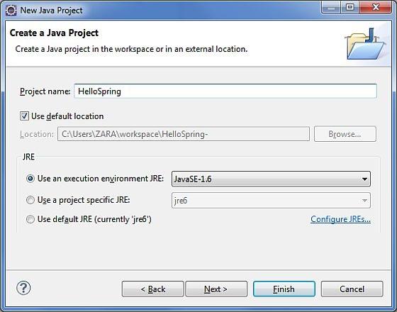第一步是使用 Eclipse IDE 创建一个简单的 Java 项目。按照选项 File -> New -> Project,最后从向导列表中选择 Java Project 向导。现在,使用向导窗口将你的项目命名为 HelloSpring,如下所示: