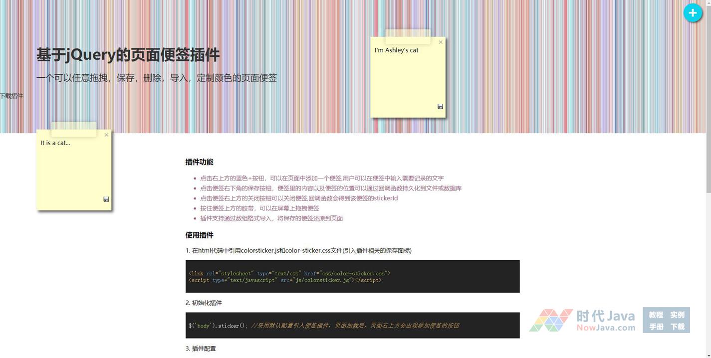 color-sticker是一款基于jQuery的页面便签插件。它是一个可以任意拖拽,保存,删除,导入和定制颜色的页面便签插件。主要的功能点有以下几点: