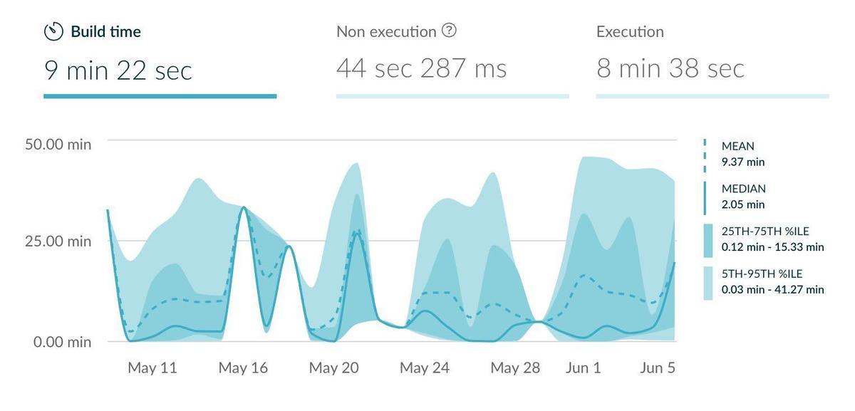 就减少项目构建时间而言,将构建迁移到 Gradle 无疑是成功的。如上所述,在 CI 和开发人员机器上,基于 Maven 的完整构建都需要一个小时或更长时间。而基于 Gradle 的平均成功构建时间为 9 分 22 秒,如以下截图所示: