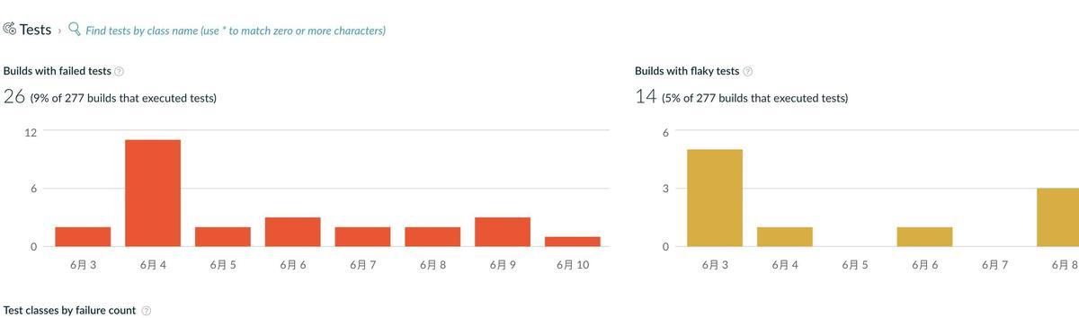 除了提高性能外,对其他功能进行探索。例如,一段时间以来,进行许多不稳定的测试。由于这些原因,构建失败的次数比预期要多,可以在 Tests 仪表板中看到这一点。使用 Gradle 分片测试来替代 CI 的通用测试方案,并帮组我们了解是否已成功解决问题。