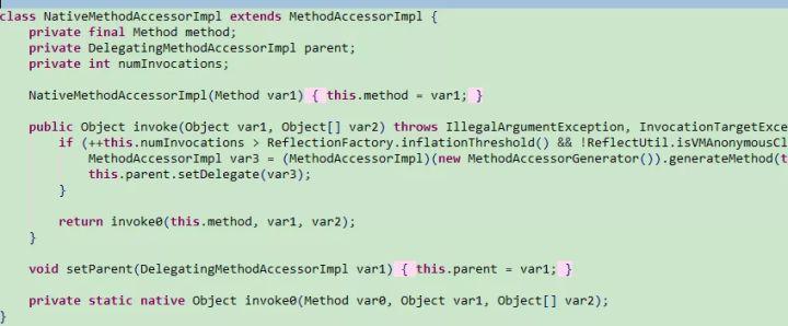 可以看到在 15 次调用 foo 方法后,第 16 次调用 foo 方法是走的 GeneratedMethodAccessor1 来调用的。我嘞个擦,怎么回事,调着调着就不一样了,于是跟代码,跟到了下面这个类: