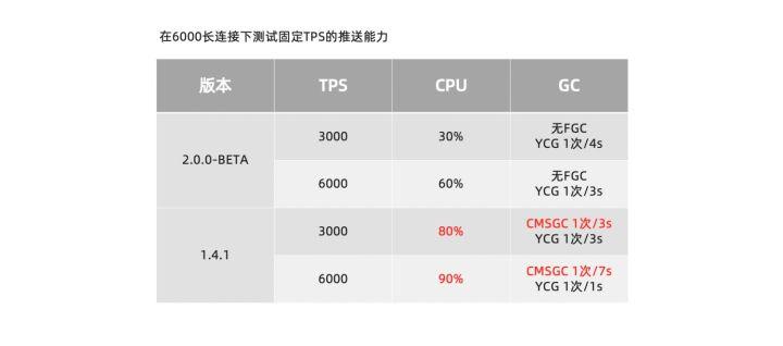 在频繁变更的场景,两个版本都处于6000个客户端连接中。明显可以发现2.0版本的性能损耗要远低于1.X版本。 在3000tps的推送场景下,优化程度约优化了3倍。