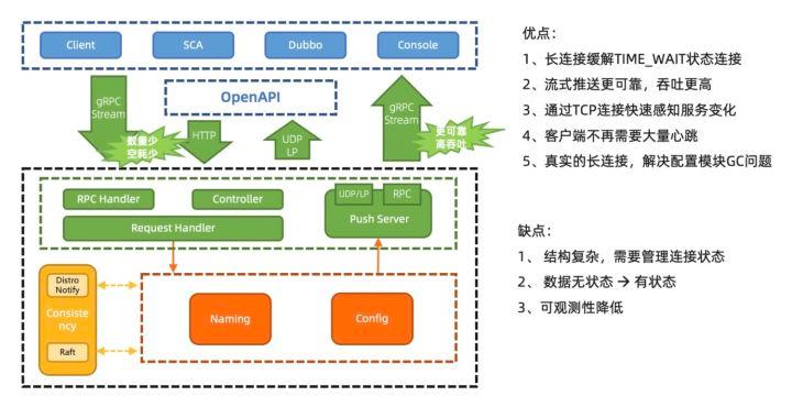配置管理之前用Http1.1的Keep Alive模式30s发一个心跳模拟长链接,协议难以理解,内存消耗大,推送性能弱,因此2.0通过gRPC彻底解决这些问题,内存消耗大量降低。