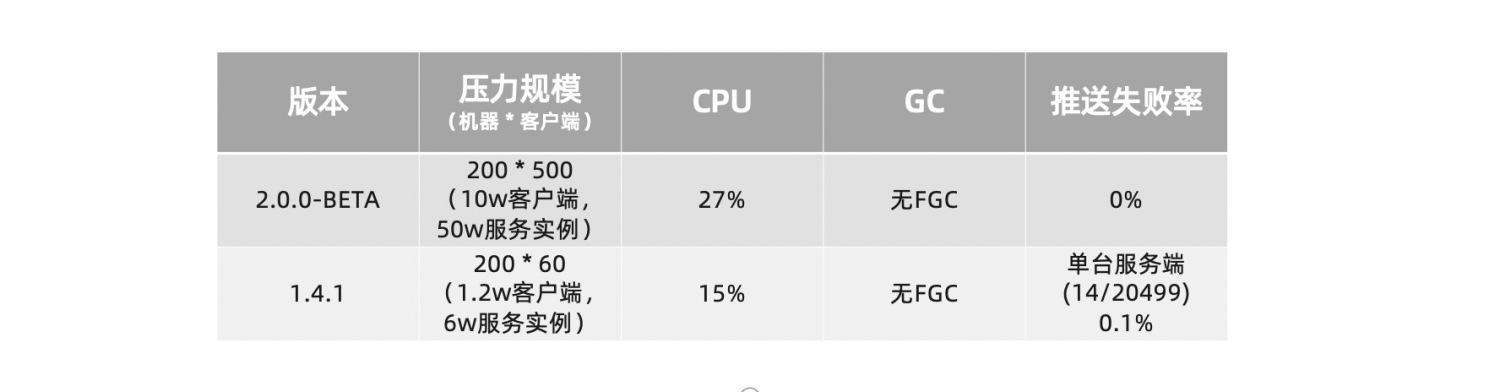 反观1.X版本,在10W、5W级客户端下,服务端完全处于Full GC状态,推送完全失败,集群不可用;在2W客户端规模下,虽然服务端运行状态正常,但由于心跳处理不及时,大量服务在摘除和注册阶段反复进行,因此达不到稳定状态,CPU一直很高。1.2W客户端规模下,可以稳定运行,但稳态时CPU消耗是更大规模下2.0的3倍以上。