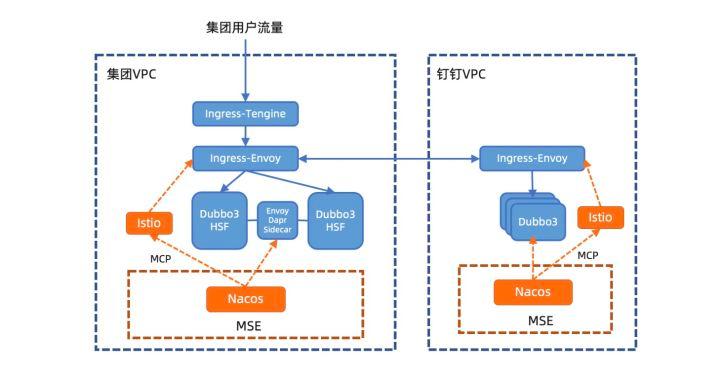 目前Nacos已经完成了自研、开源、商业化三位一体的建设,阿里内部的钉钉、考拉、饿了么、优酷等业务域已经全部采用云产品MSE中的Nacos服务,并且将阿里和云原生的技术栈无缝整合。 下面我们以钉钉为例简单做一下介绍。