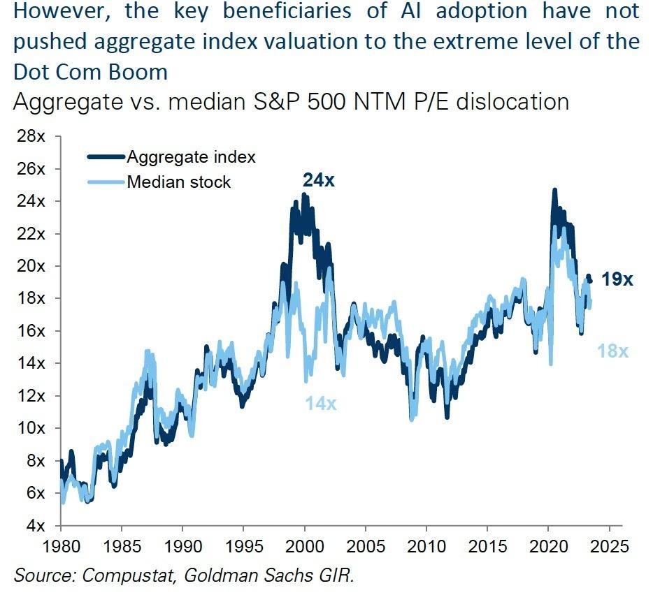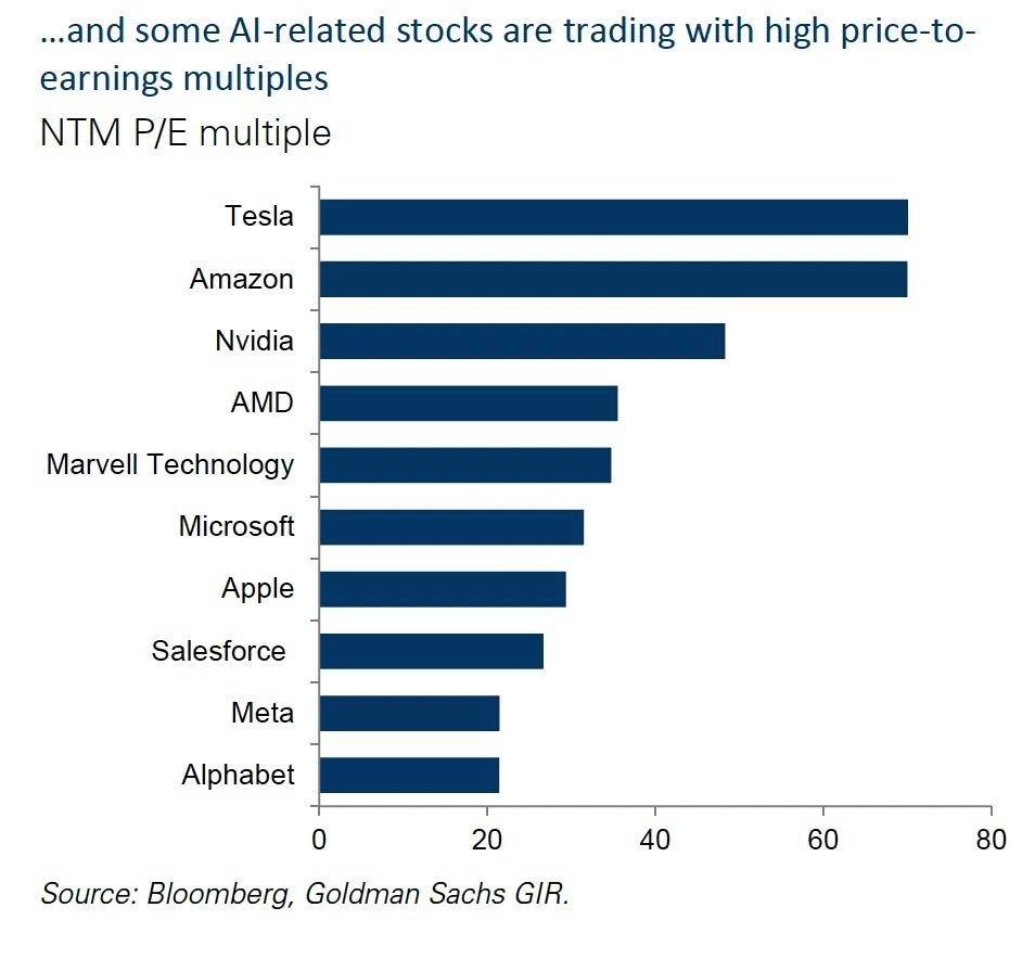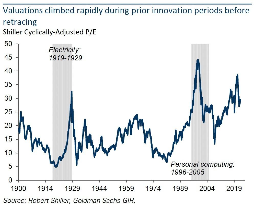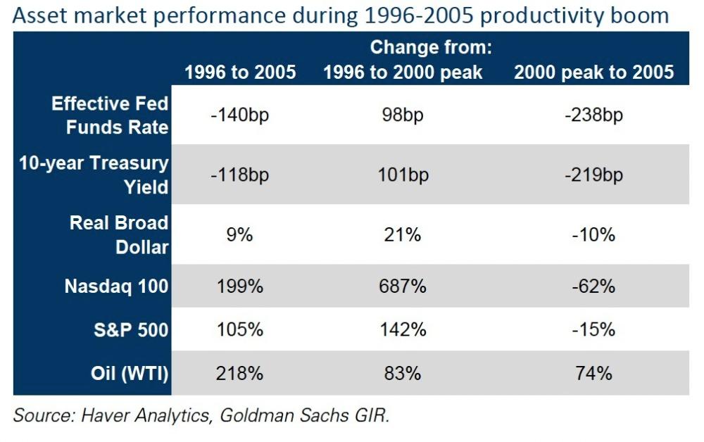 谈到市场,高盛的市场策略师多米尼克·威尔逊(Dominic Wilson)和维姬·常(Vickie Chang)指出,在过去创新引领的生产力繁荣时期,如电力(1919-1929年)、个人电脑和互联网(1996-2005年)广泛普及之后,股票价格和估值的急剧上升成为泡沫,并最终破灭。