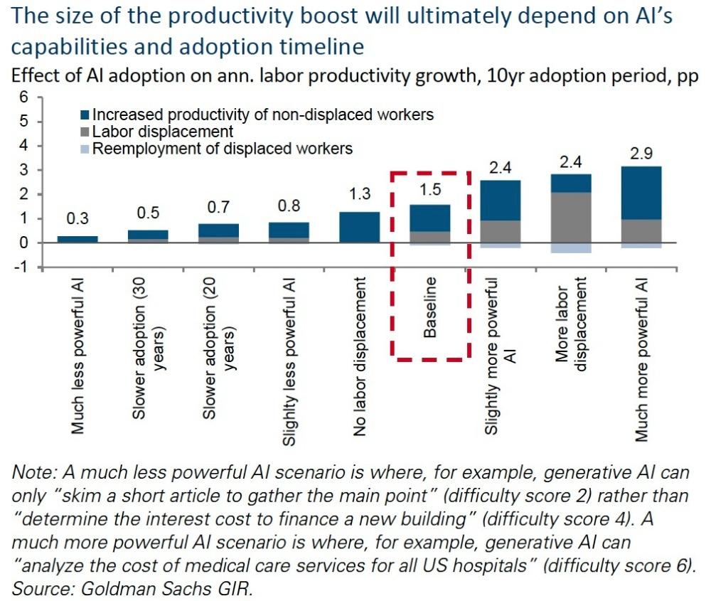 尽管我们估计人工智能的广泛应用对生产率增长的推动作用相当大,但它也具有高度的不确定性,最终将取决于人工智能所能完成的任务的难度水平、自动化工作的数量以及应用的速度。我们对这些因素的不同假设表明,对美国年生产力增长的促进作用可能在0.3-3.0个百分点之间,尽管在大多数情况下,这种促进作用在经济上仍然是显著的。