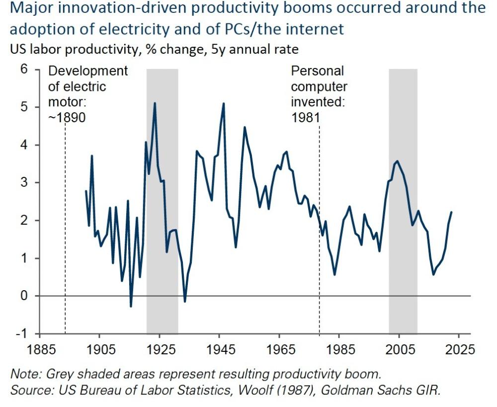 多米尼克·威尔森(Dominic Wilson)和维基·常(Vickie Chang)评估了过去创新驱动的生产力繁荣对市场的影响,以及这对未来潜在的人工智能生产力繁荣可能意味着什么。