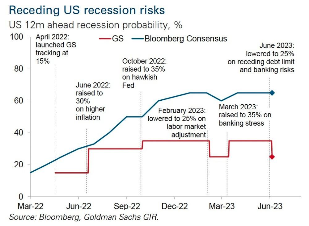 --鉴于债务限额的尾部风险已经过去,而且我们更加确信银行收紧贷款只会适度拖累国内生产总值,因此我们最近将12个月的衰退概率下调至25%。