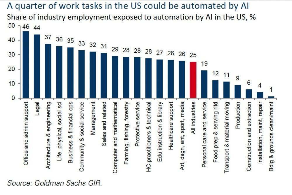 我们的主要发现是,许多工人花费大量时间执行人工智能模型非常适合自动化的任务。特别是,我们估计,大约三分之二的美国职业面临至少某种程度的人工智能自动化,而在这些面临自动化的职业中,大多数职业的工作量(25-50%)都有可能被取代,尽管只是部分。在根据每个职业在美国的就业比例对职业层面的估计值进行加权后,我们估计目前四分之一的工作任务可能会被人工智能自动化,其中行政(46%)和法律(44%)职业的风险尤其高,而建筑(6%)和维修(4%)等体力密集型职业的风险较低。