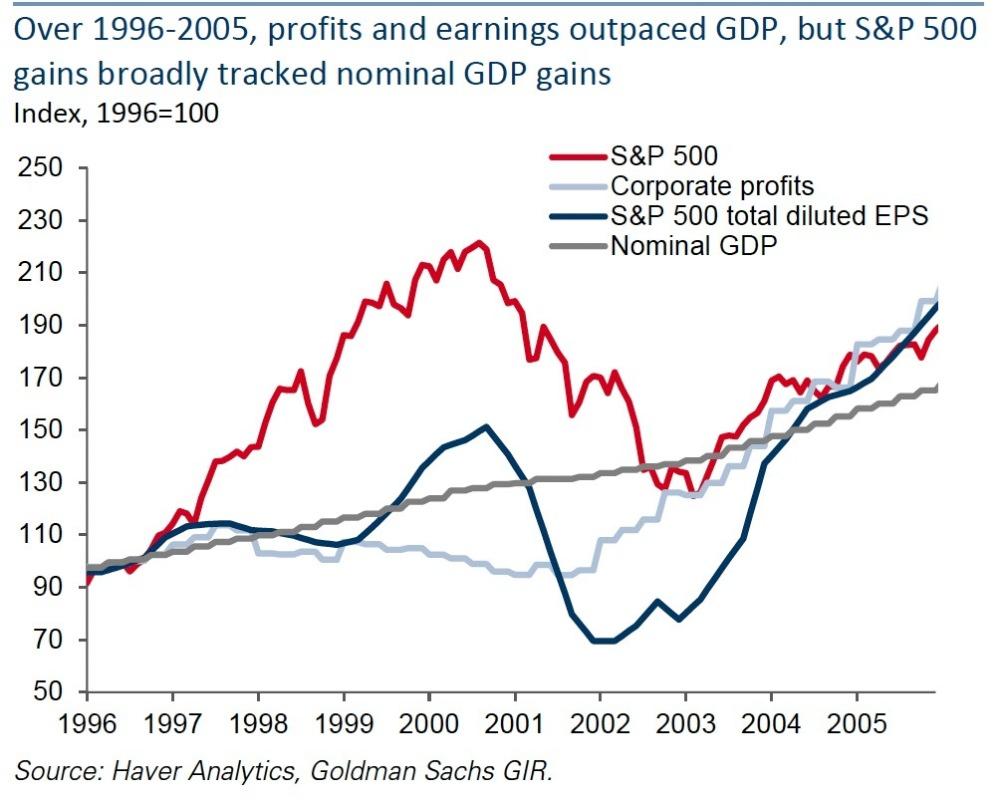 1996-2005年期间,利润和收益超过了GDP,但标准普尔500指数的涨幅与名义GDP涨幅基本一致。