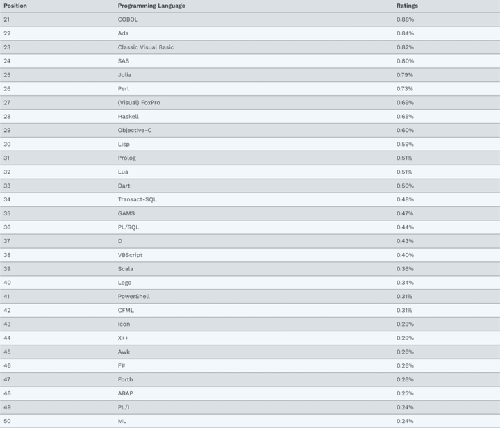 以下为 Top 21-50 的编程语言榜单: