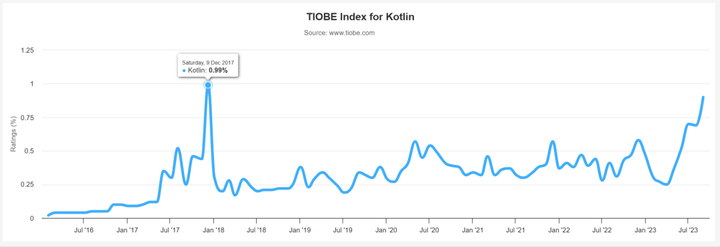 因此,Kotlin 刚问世不久其受欢迎程度就直线上升,又有谷歌官方的支持,在 2017 年占据了接近 1% 的市场份额,在 Top 20 榜单中强势占据一席。