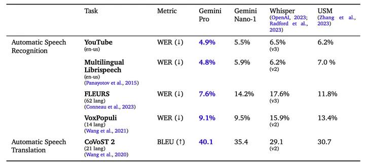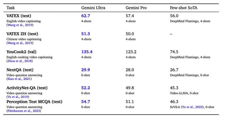 视频理解能力更能体现一个多模态大语言模型的能力,在这些数据集上,Gemini 从每个视频片段中均匀采样 16 帧作为输入。在几个少样本(few-shot,zero-shot)的任务中,Gemini Ultra 都达到了 Sota 的性能。