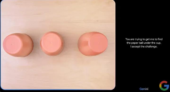 Human :(动作-视频)往桌子上丢了一个纸球,然后拿出了三个杯子,其中一个杯子把纸球盖上 Gemini:你是让我玩猜纸球在哪个杯子下面的游戏吗,我接受挑战 Human:(动作-视频)快速打乱杯子顺序 Gemini:在左边的杯子下面