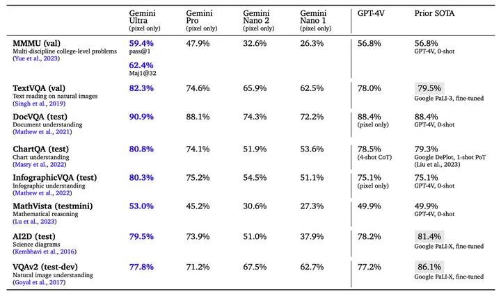 这里 Gemini 和 GPT-4、PALM 2-L、Claude 2 等业内知名大模型进行了对比。这里需要注意的是,这里的对比很难做到完全公平,有些任务中,比如 MMLU 这个测试集的对比中,Gemini Ultra 和 GPT-4 的问答方式是思维链接(CoT),而 Gemini Pro、GPT-3.5 等模型用的是 few-shot 的方式进行问答,一般来说 Cot 的方式会强于 few-shot 的方式。这里的 Cot@32 指的是每个问题回答 32 次,选出其中出现次数最多的那个答案作为输出。