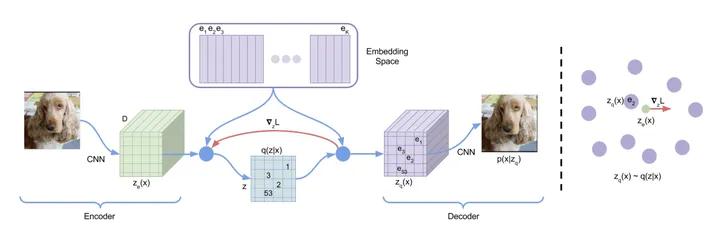 从 Gemini 的框架示意图和技术报告分析,我们猜测(技术报告并没有明确说)它采用了 token 化的方案来做,先分别学习图像 patch 和音频片段的 codebook。一旦学习完成,可以将图片 patch 或者音频片段用类似于文本的方式去处理。图片参考VQVAE,音频参考 Google USM。 这里以图像为例讲解一下这个过程。