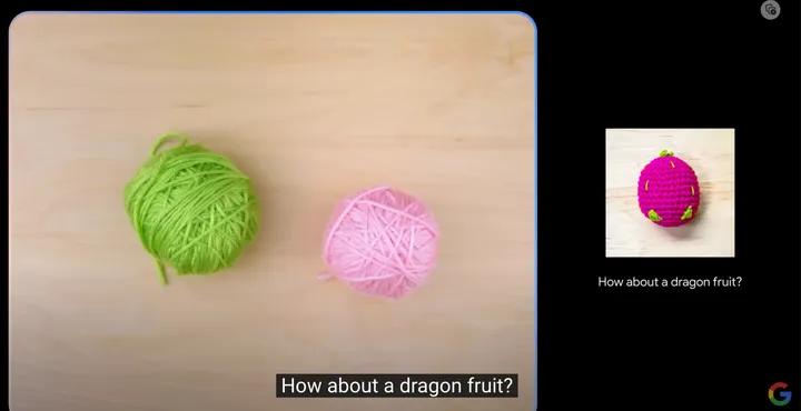 Human:(动作-视频)放出绿色和粉色毛线球 (文本)给我一些建议我可以用这做什么 Gemini:(图)+ 一个火龙果咋样