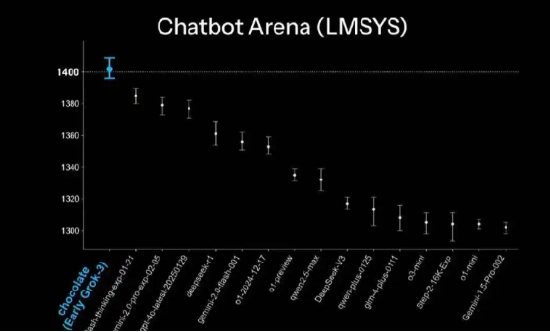 在大模型竞技场 Chatbot Arena(LMSYS)中,Grok-3版本的得分达到1402分,超过了包括ChatGPT-4o、DeepSeek-R1等在内的所有其他模型。