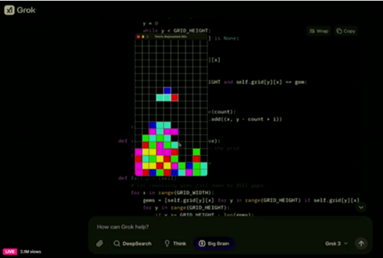 据马斯克介绍,Grok-3比上一代的Grok-2能力提升了一个数量级。在后续AI用例演示过程中,马斯克及其团队成员让Grok-3 寻找去火星的时间窗口,演示了其信息收集和推理能力,同时还创作一款融合《宝石迷阵》和《俄罗斯方块》的游戏,展示了Grok-3的创意能力。