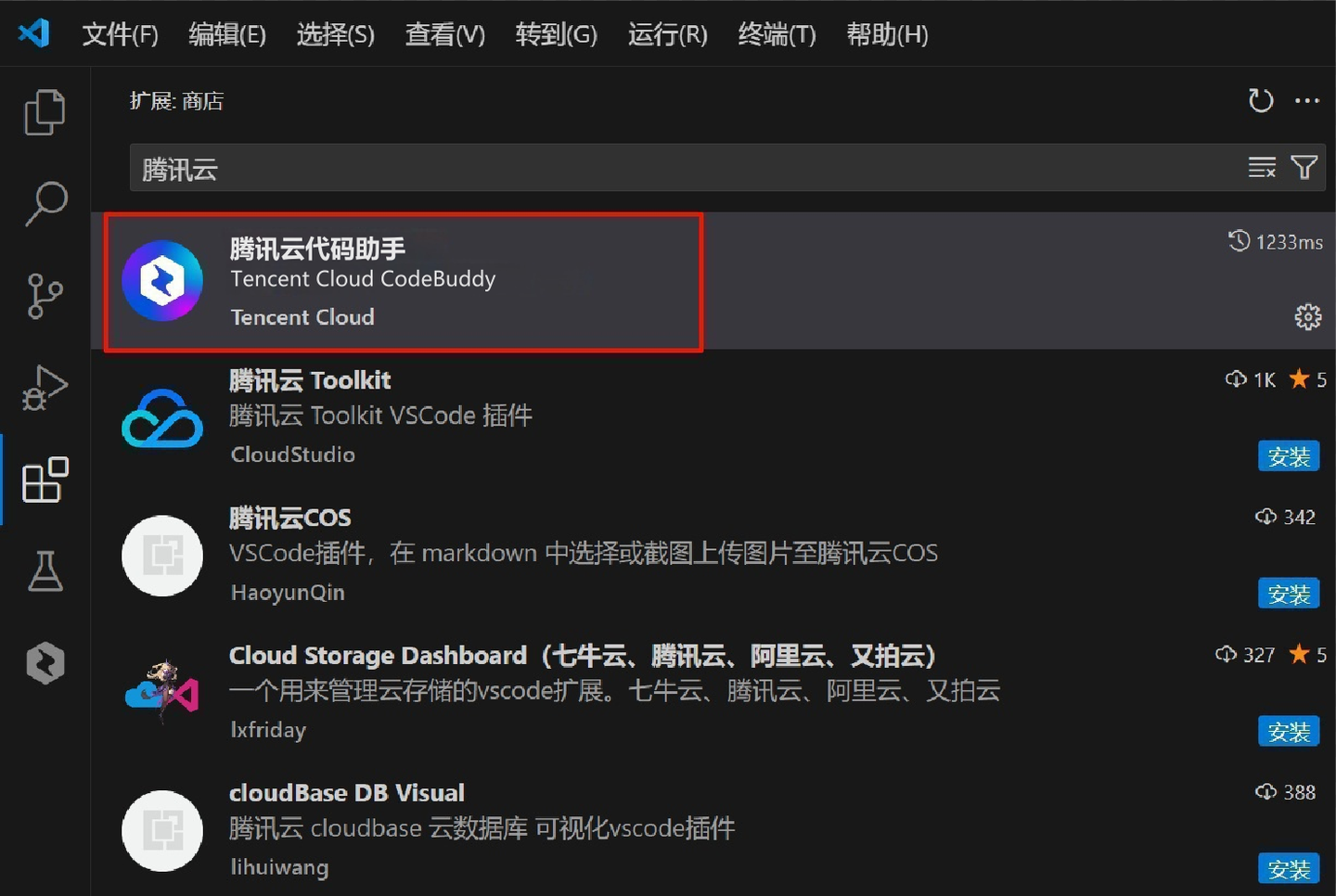 从 IDE 插件市场安装:您也可以在 VS Code 插件市场手动搜索腾讯云代码助手并下载安装。