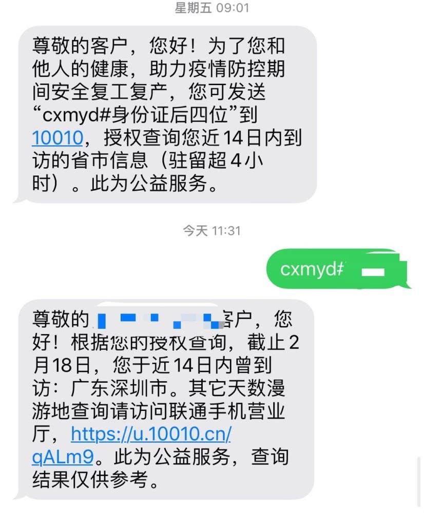 据悉,目前我国16亿手机用户均可通过以上短信方式查询本人前14天内到过的停留4小时以上的到访地,可查询到具体地市。该短信可作为本人的行程证明使用。